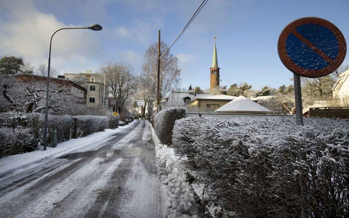 Snön täcker skylten ”Kör sakta – lekande barn” som sitter uppsatt på en stolpe som sitter på den sida av gatan med udda nummer, precis där den svänger lite mjukt åt höger. I trädgården nedanför berghällen med flaggstången på framsidan vid nummer nio, har det byggts en snögubbe. Kloten som staplats på varandra innehåller dock en hel del löv, så snögubben är aningen mer brunspräcklig i färgskalan, än klassiskt vit. Snögubben har fått grenar till armar, morot till näsa och clementiner – ser det ut som – till ögon. Vad han har fått som huvudbonad är svårt att se, men det ser ut som en färgglad liten kartong, typ asken till en julklappsleksak.