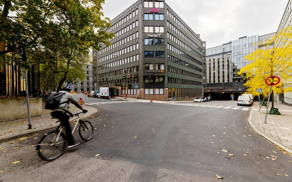 Skylten som visar att höjden är 3,3 meter in till parkeringshuset under Sheraton – gammal klassisk skateboardåkarmark – har fått sig en liten knack och lutar några grader in mot fasaden. En kvinna i svart kappa har lutat sin dataväska mot stolpen, en grå bil stannar till, hon tar väskan, öppnar bakdörren och kliver in, bilen gör en tvär vänster och kör bort Klara Södra kyrkogata. Fönstret på bottenvåningen i 18 a är vidöppet. På stupröret till höger om dörren en rektangulär röd skylt riktad i sydvästlig riktning som visar att det är 9,7 meter i skyltens riktning till brandpost.