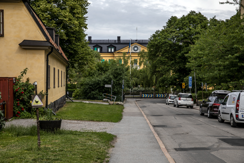 I högersvängen ner mot backen – på smidesstaketet sitter två gula och blå pilskyltar som signalerar skarp kurva – som sedan hakar på Högalidsgatan, en grusväg ner mot hundrastplatsen. Mitt emot, i entrén till Borgerskapets Nya Kristinehof, står en skylt om Grannsamverkan lutad mot rutan till vänster om dörren. I handikapprutan efter svängen står en liten grå bil parkerad, den har inget handikapptillstånd i rutan. Framför fönstren på nedre våningen vita järngaller, även framför de små vertikala källarfönstren i den murade grunden.