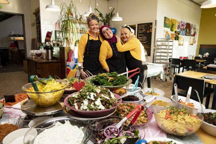 På Tavernan på Mångkulturellt centrum i Fittja börjar dagen med en gruppkram, sedan sätter Silvana Hirmiz, Nadia El Harrak och Malin Juhlin i gång med maten till dagens vegetariska lunchbuffé. De följer inga recept eller planeringar utan går på ren och skär känsla.