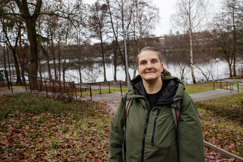 Han brukade träffa sina kompisar här vid Liljeholmen. Han sa till dem att han hade hittat en tjej på båten, men de trodde honom inte. ”Vänta bara så ska ni se att hon kommer”, sa han. Då var de på den här platsen. När jag kom och kramade honom blev de snopna. Sen dess har vi varit tillsammans. Tidigare hade jag killar som bara utnyttjade mig, men Vargen var en bättre man.