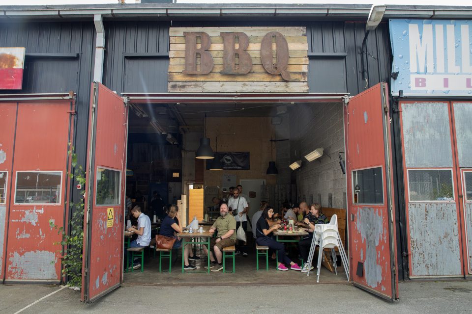 Bortom uteserveringens staket står maskiner, skrot och lastbilar, bland industri- och lagerlokaler. Restaurangköket finns i containrar och är utrustat med två IKEA-kokplattor. Men i de 120 grader varma rökarna har nästan 80 kilo ”brisket” – styckade oxbringor – legat i tre timmar och börjat få en mörk yta av den brinnande ek-veden.