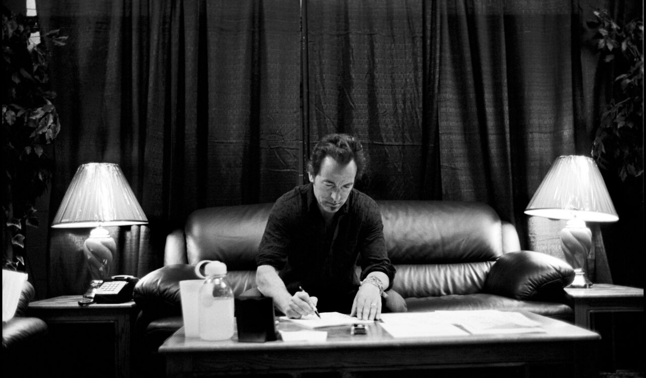 Låg scen. En kamera på varje sida. Två djupa svarta skinnfåtöljer, bord mellan dem. I fonden en uppdragen bild på bokomslaget – ett foto av Bruce Springsteen taget i Haddonfield i New Jersey 1978. Bilen, vars motorhuv han lutar sig mot, är en Corvette från 1960: ”Jag köpte den för 5 600 dollar av en kille som jobbade i glasskiosken därhemma”.