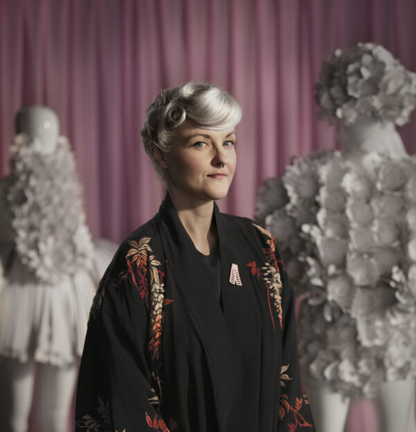 Bea Szenfeld jobbar helst med papper som material och har fått Cancerfonden att byta ut sidentyget i år.