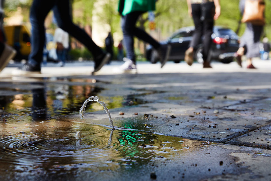 I skärningen mellan några cementplattor i trottoaren utanför dörren till Konstfrämjandets lokal på Swedenborgsgatan reser sig en knappt decimeterhög vattenpelare. Det är dock – vilket många säkert förleds att tro vid en första anblick – inget olyckligt läckage.